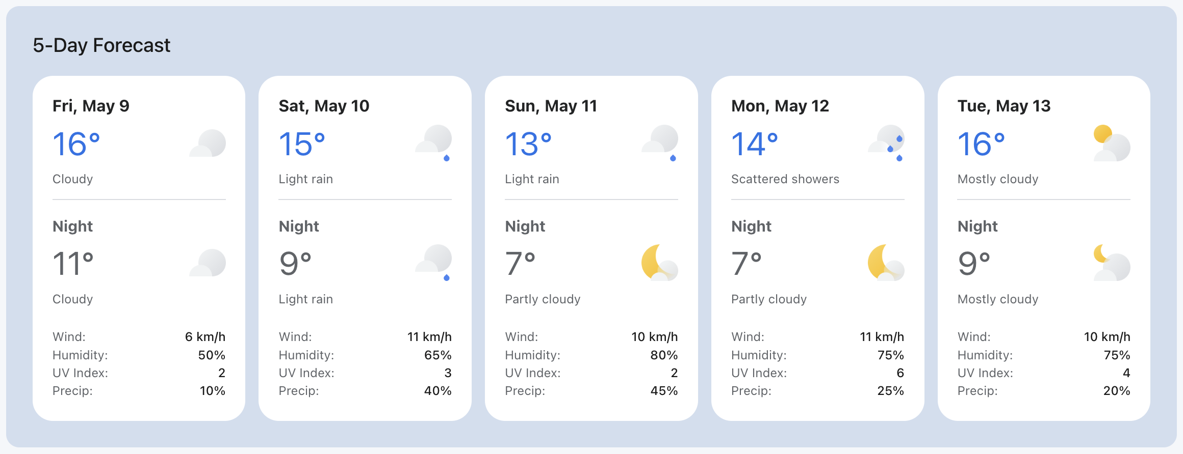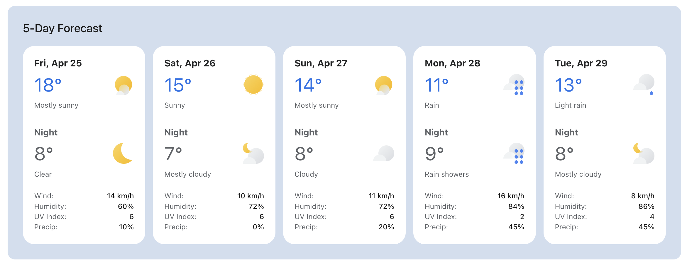 - Daytime (7:00 AMβ7:00 PM) and nighttime (7:00 PMβ7:00 AM) weather descriptions, each with corresponding icons