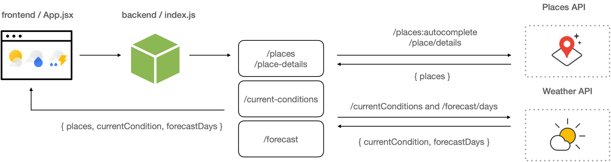 Now on to the backend. google_weather_backend runs on an Express web server, listening on port 4000 (you can change this in the .env file). Requests are routed to index.js for handling. There are four main methods, each corresponding to the /places, /placeDetails, /currentConditions and /forecast endpoints called by google_weather_frontend.