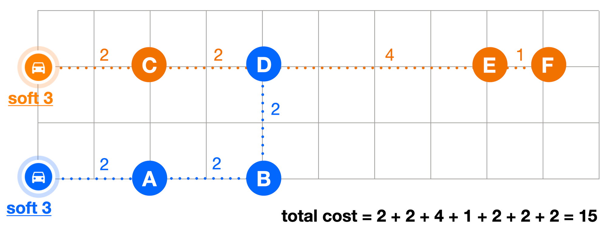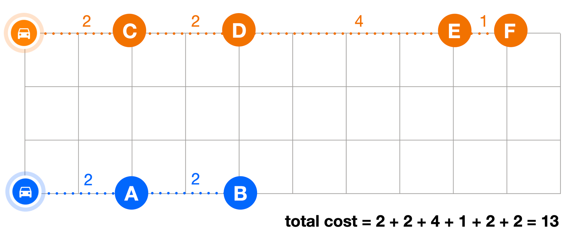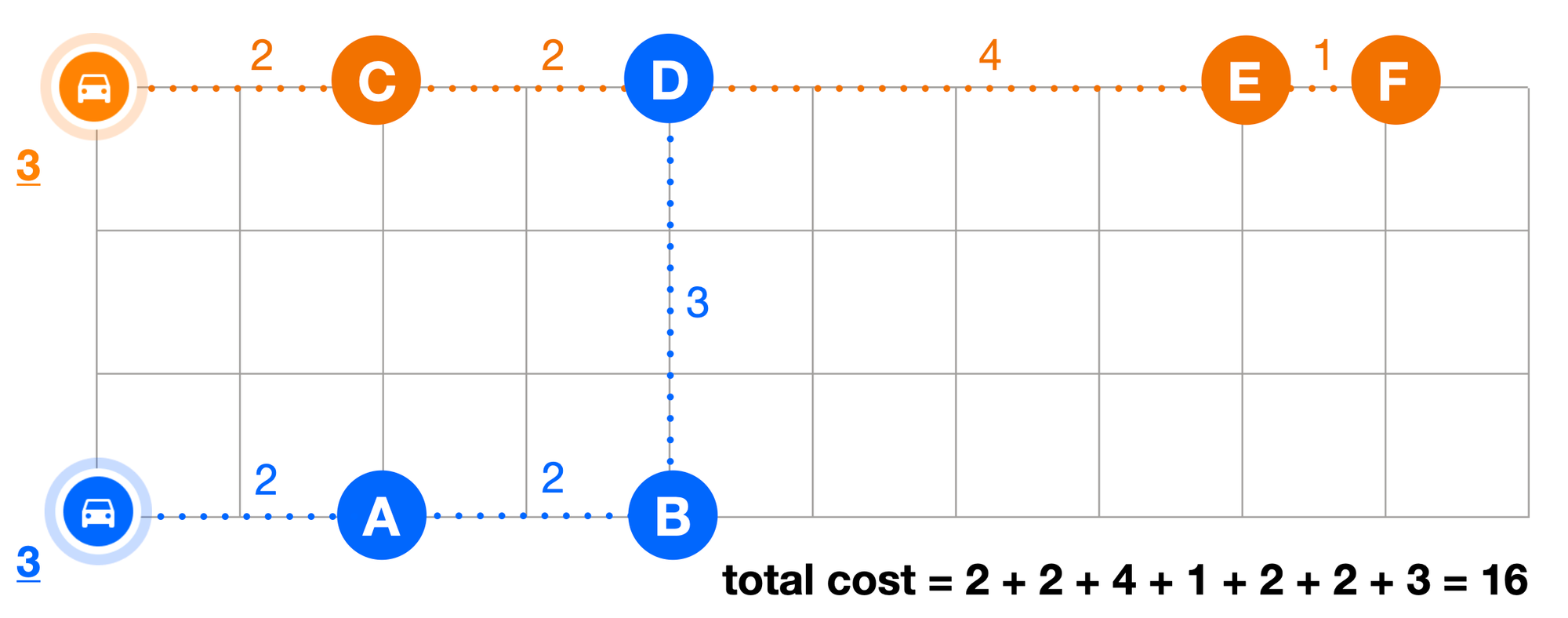 The total cost now is 2 + 2 + 4 + 1 (orange) + 2 + 2 +3 (blue) = 16, or 3 more than the route optimal solution we saw in the first instance (Example A). The difference in cost can be entirely attributed to the detour of 3 units that driver blue had to make in going from B to D to keep the route balanced.