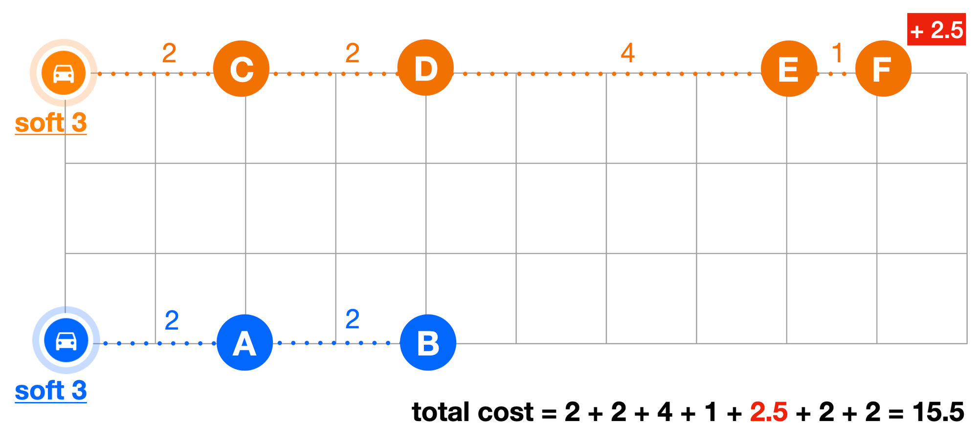 }The total cost of an unbalanced 4 stop (orange) + 2 stop (blue) route solution is now 2 + 2 + 4 + 1 + 2.5 (penalty) for orange and 2 + 2 for blue = 15.5. This is less than the total cost of 16 in the perfectly balanced route given in Example B, so the unbalanced solution is preferred.