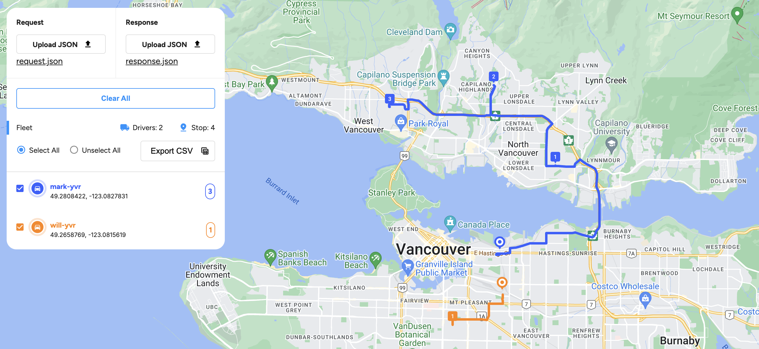 }With these fixed costs added to the vehicle object, it now is optimal to only send out driver mark-yvr (blue) or will-yvr (orange), but not both.