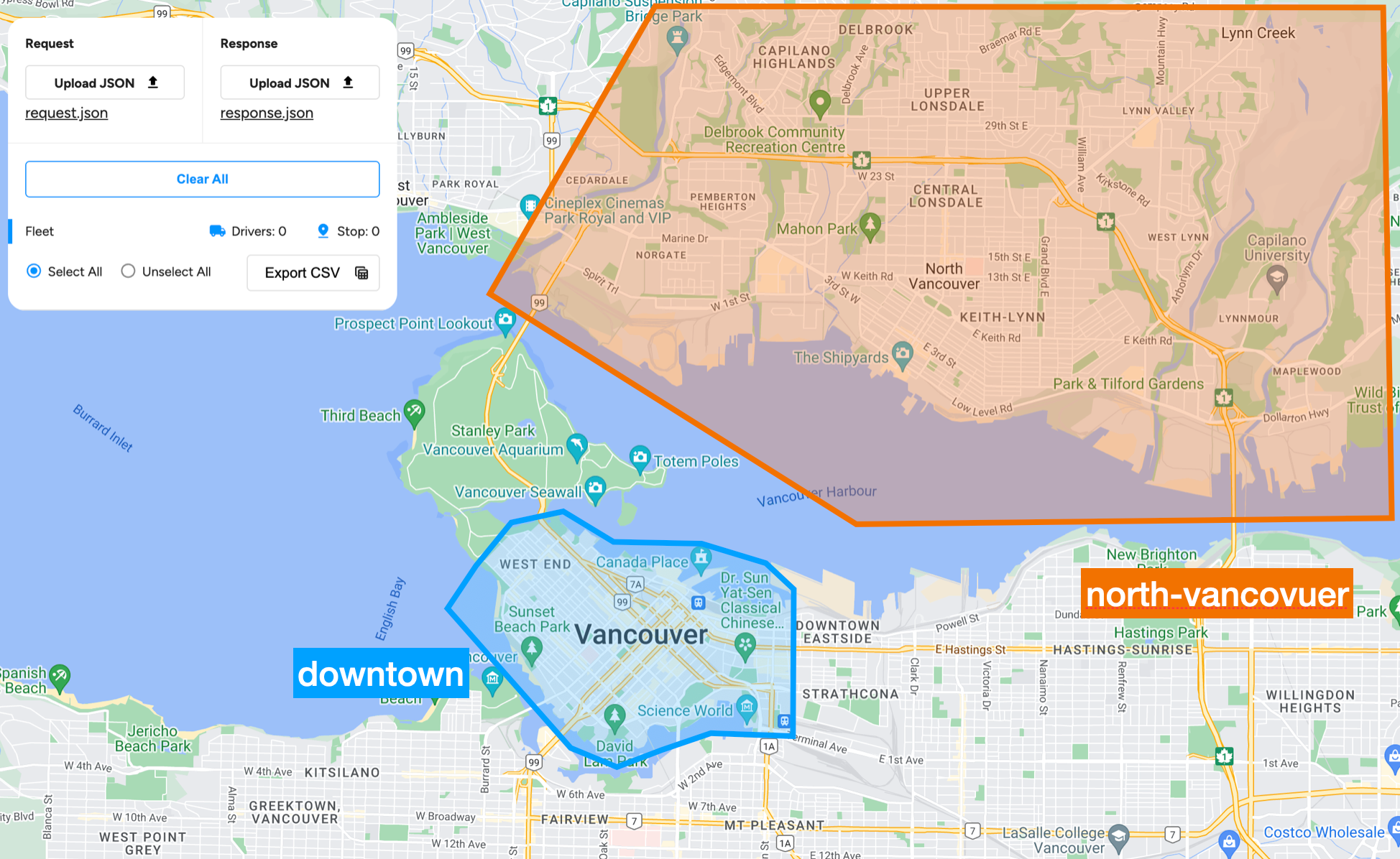 For example, let's say you have two regions, downtown Vancouver (downtown) and North Vancouver (north-vancouver) as shown in the map below.
