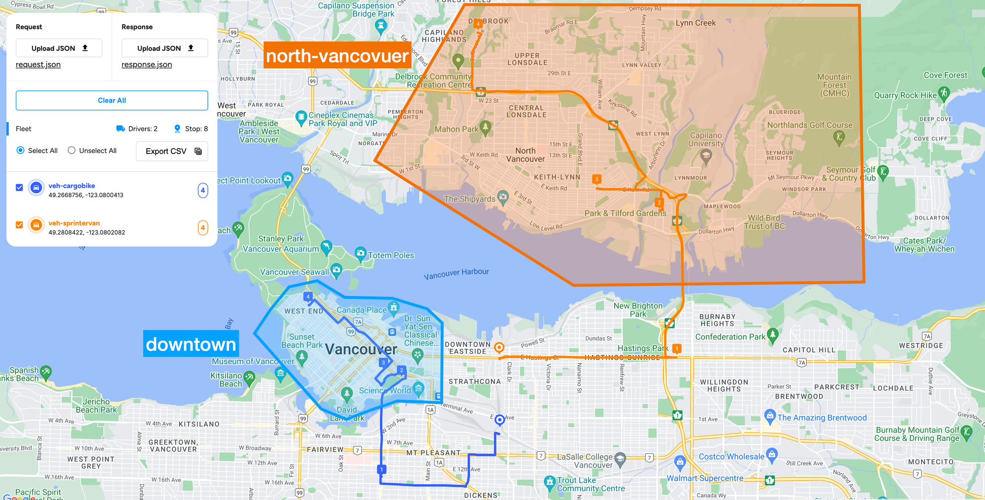As we hoped, both the downtown and north-vancouver regions are served by veh-cargobike and veh-sprintervan respectively. Of the remaining 2 deliveries in East Vancouver, one was assigned to veh-cargobike and the other to veh-sprintervan, depending on which was passing through.