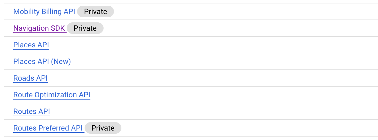 On the next page, press [ENABLE] to bind the Nav SDK to your project. To check that it's been set up correctly, click the [<-] back button to return to your project dashboard. Navigation SDK (Private) should show right below the Mobility Billing API (private) entry.