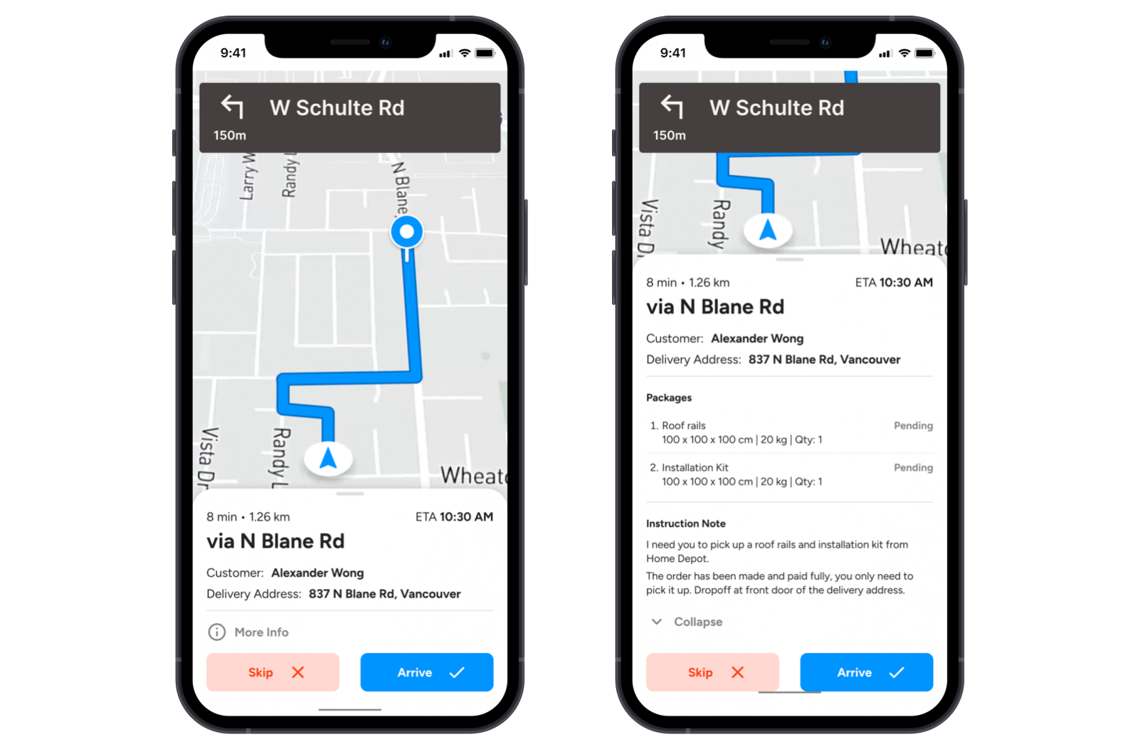For example, with the Nav SDK, you can overlay customer names, delivery instructions, and package details on the bottom info panel, allowing drivers to see all the necessary information without leaving the turn-by-turn navigation screen. In contrast, using the Maps URL method would force drivers to exit Google Maps and switch back to their delivery app to retrieve this information - an unnecessary distraction that most drivers can't afford.