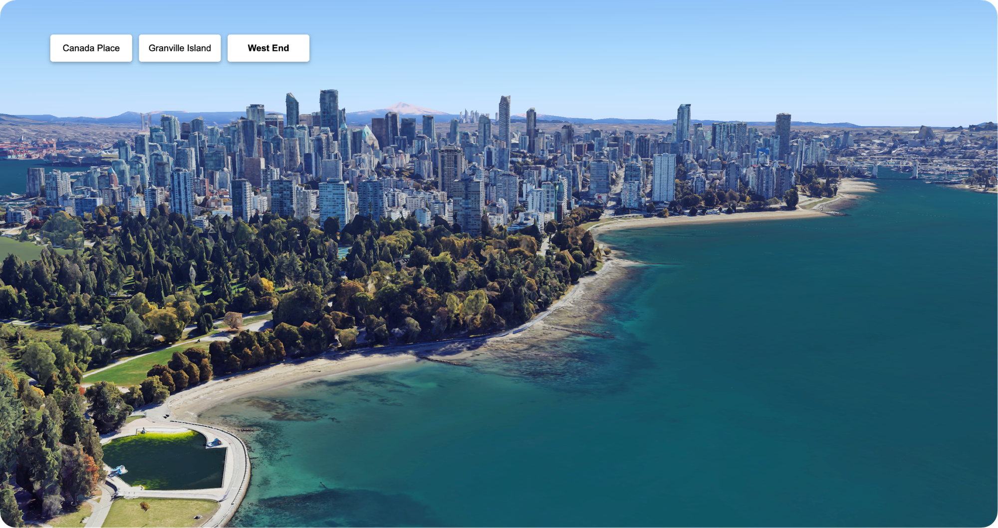 In this last section, we'll apply what we've learned in this blog post by building a tourist explorer app that lets user explore preset tourist destinations in Vancouver using the Google Photorealistic 3D Tiles API.