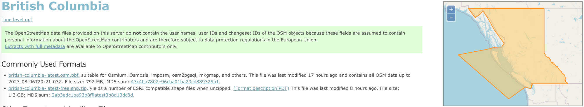 wget http://download.geofabrik.de/north-america/canada/british-columbia-latest.osm.pbf(you can install the wget application by following these instructions) or downloading the data file directly from the GeoFabrik website.