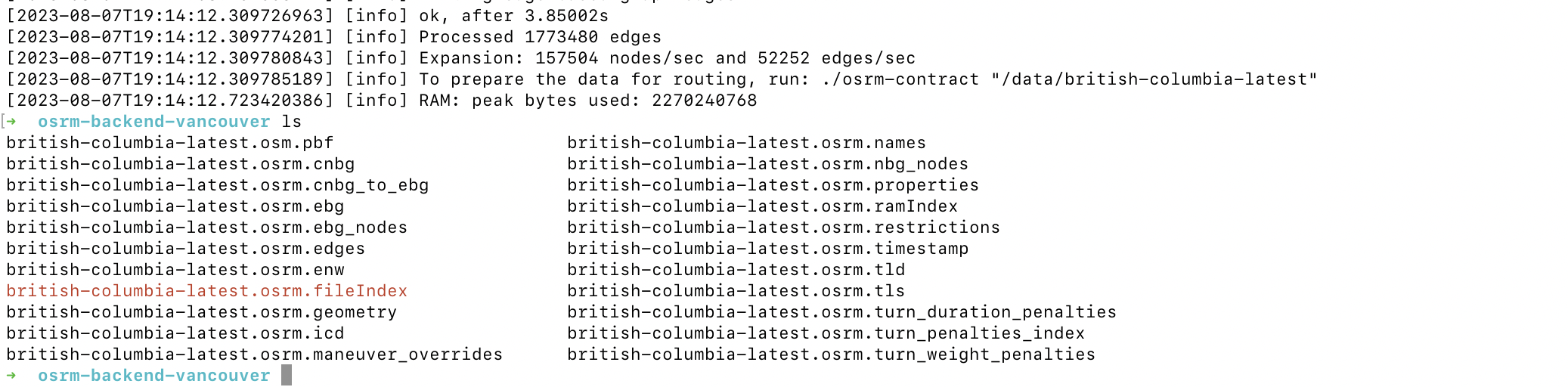 If it worked, you'll get a success message and see a bunch of new files in the directory. These files contain the processed map data that OSRM uses to quickly generate routes and driving directions.