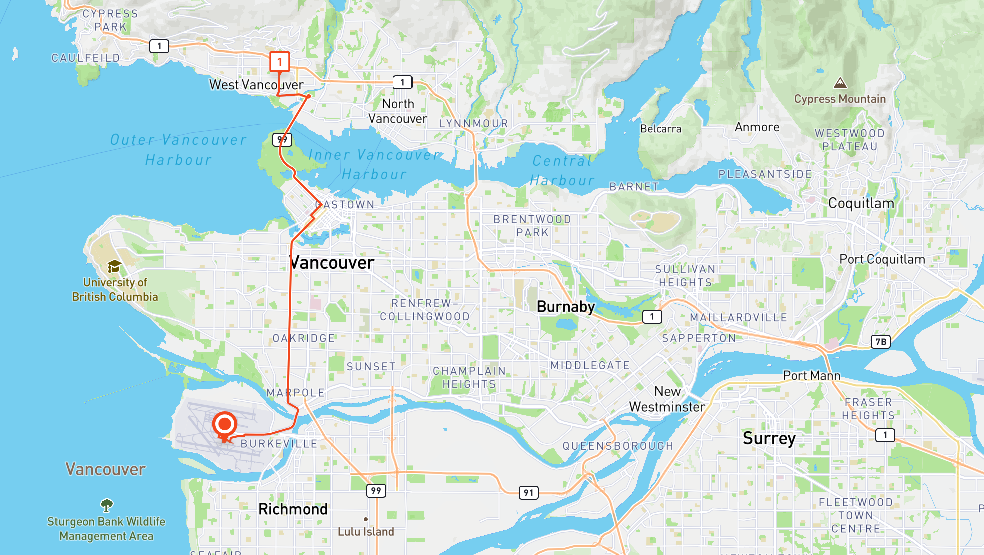 The quickest way to get started with OSRM is to run the main routing engine (osrm-backend) on your local machine and start making API calls to it to see what comes back. In this example, we'll ask OSRM to generate a route starting from Vancouver Airport (49.195113, -123.1814231) to 1074 Jefferson Ave, West Vancouver (49.2877865,-123.0672749). Let's get started!