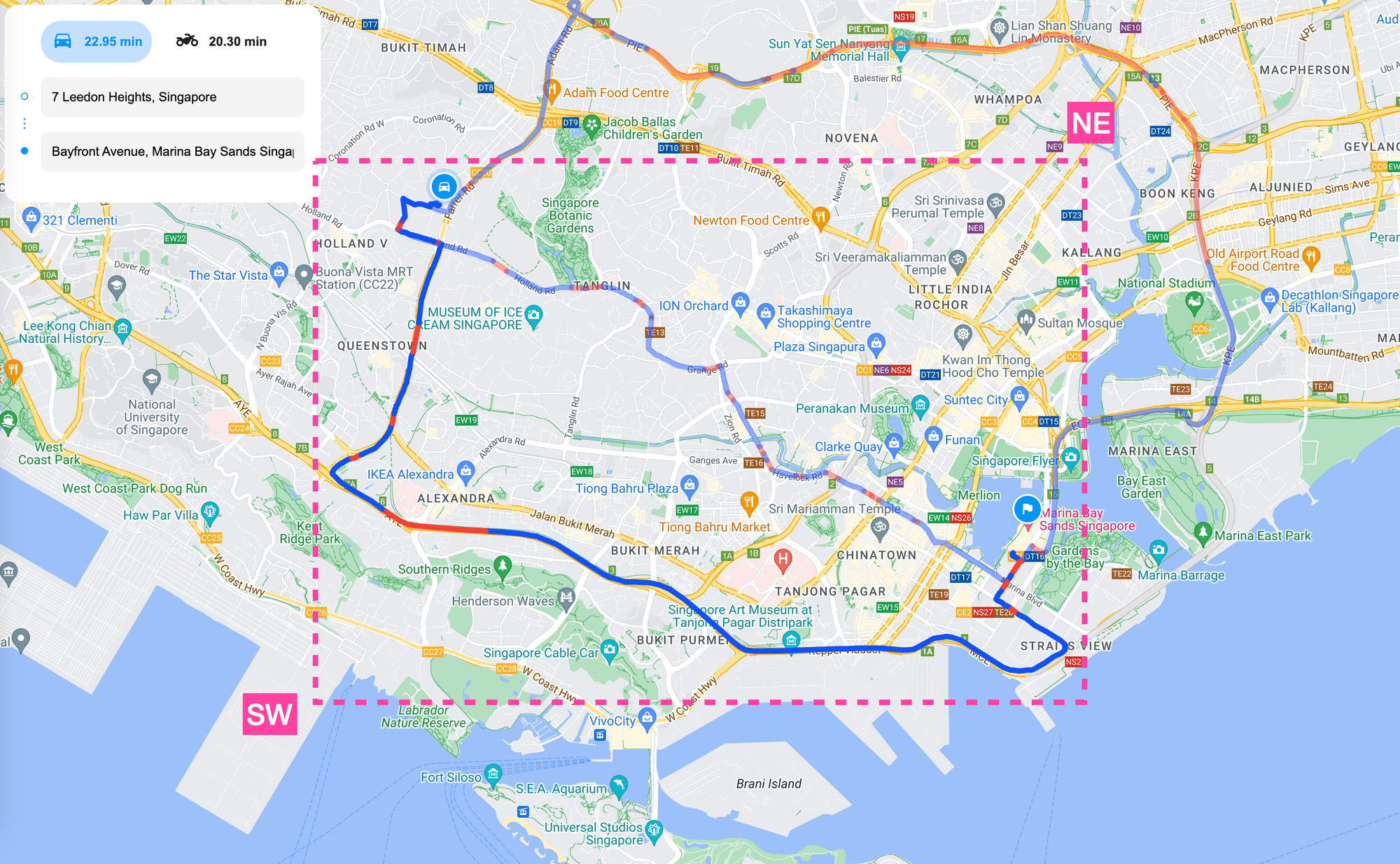 Here's a basic example of how a Compute Routes call in the Routes API is structured. We'll set 7 Leedon Heights, Singapore as the starting point and Singapore Changi Airport as the destination.