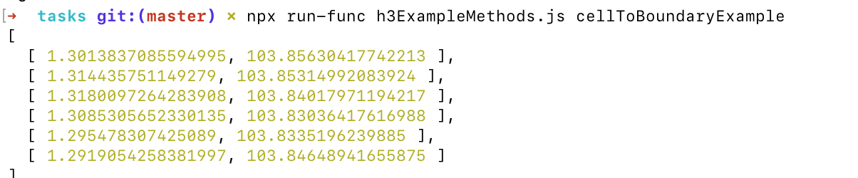 To run these examples, clone the Github repository and in your terminal, navigate to the /src/tasks folder and run npx run-func h3ExampleMethods.js <method_name> e.g. npx run-func h3ExampleMethods.js cellToBoundaryExample.