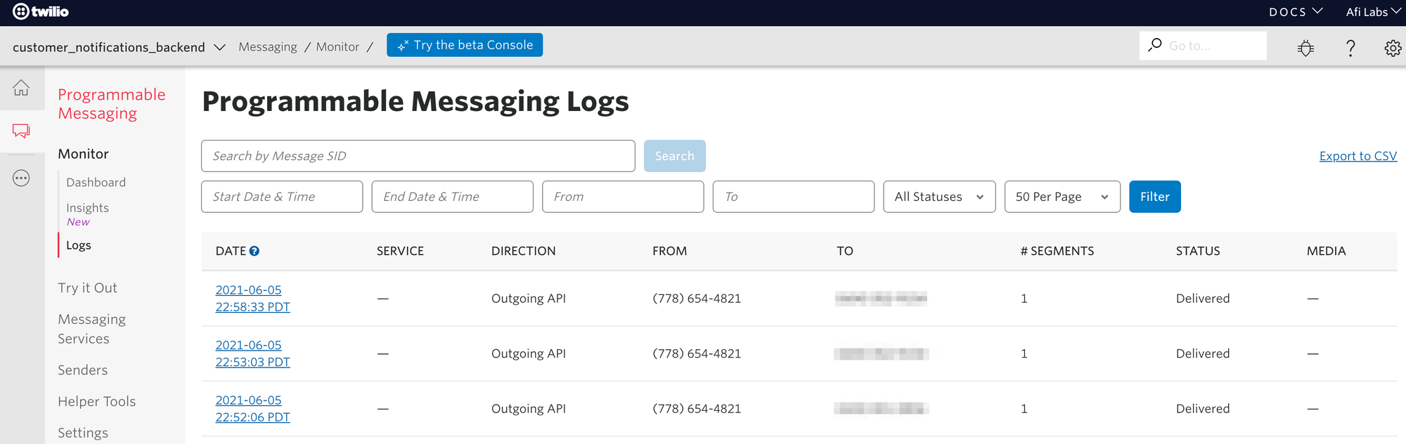 You can verify this by logging into your Twilio account and checking the programmable messaging logs.
