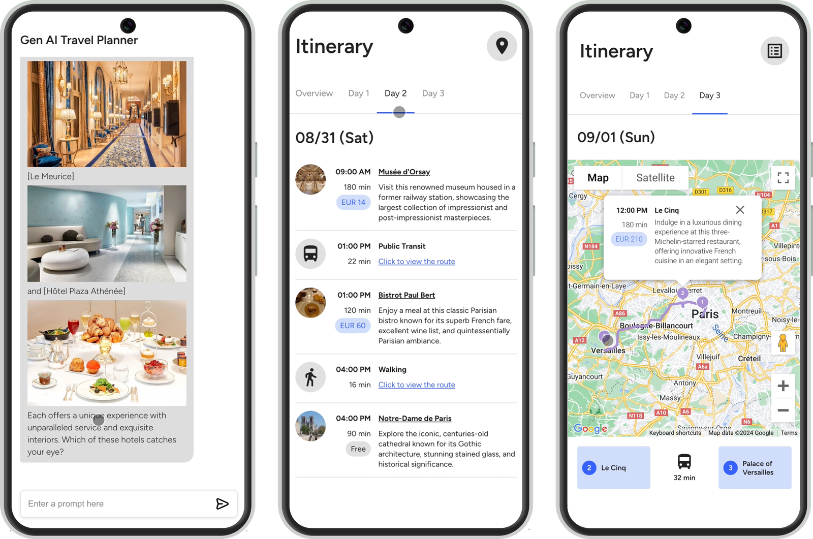 Respons dari LLM dan place_id yang disertakan kemudian dapat digunakan oleh aplikasi perencanaan perjalanan untuk memberikan rekomendasi yang dipersonalisasi, bersama dengan ulasan, foto, dan peringkat untuk objek wisata dan landmark utama.